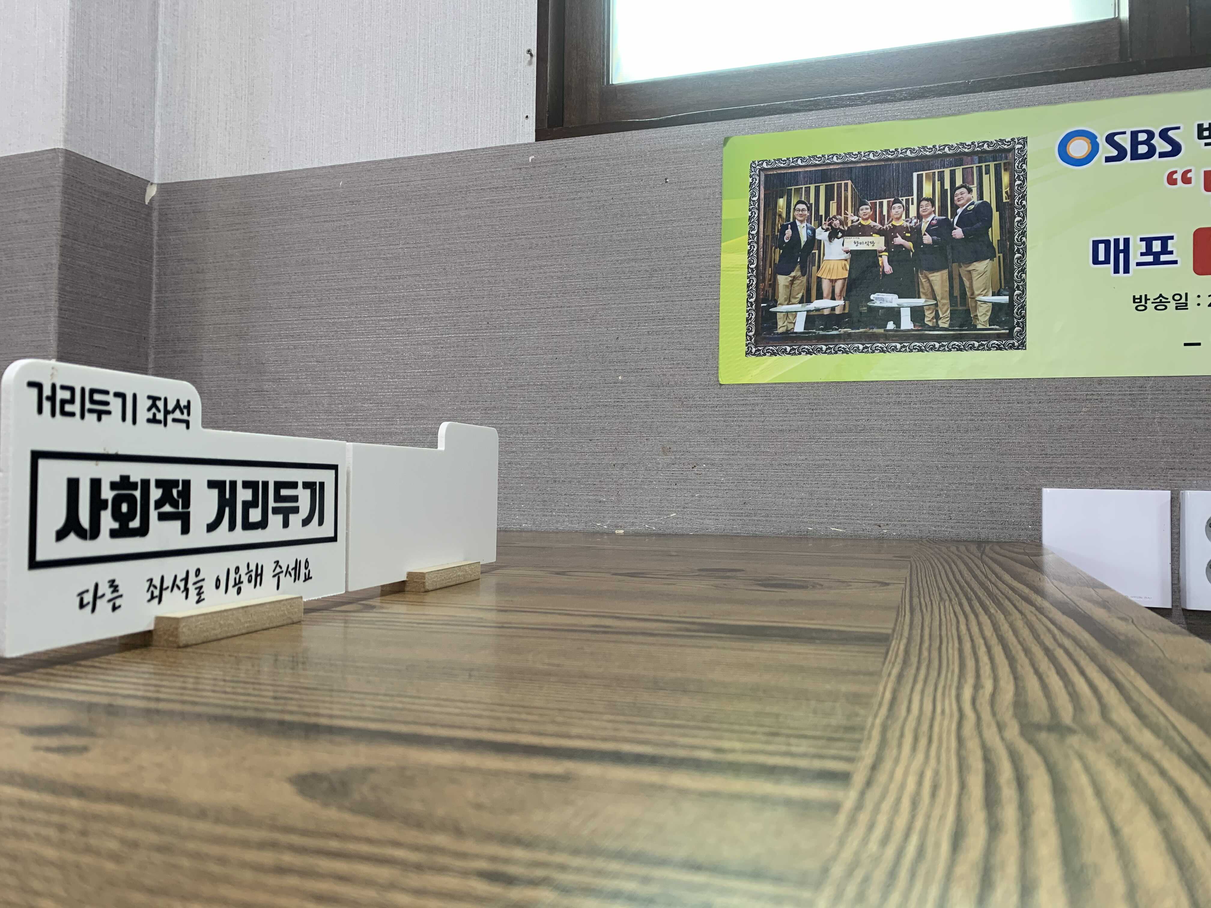 사회적 거리두기로 한 좌석씩 떨어져서 식사를 할 수 있습니다.