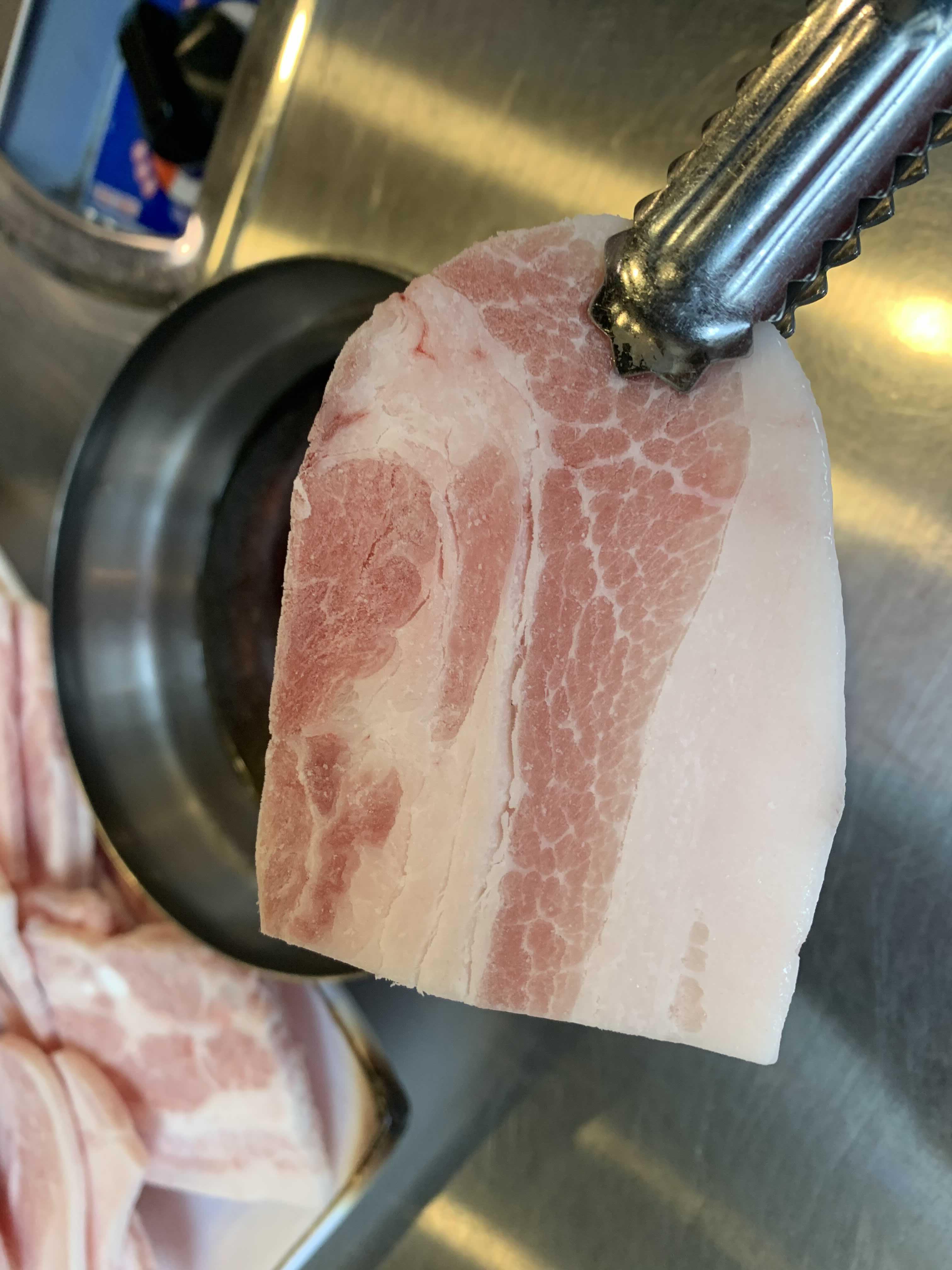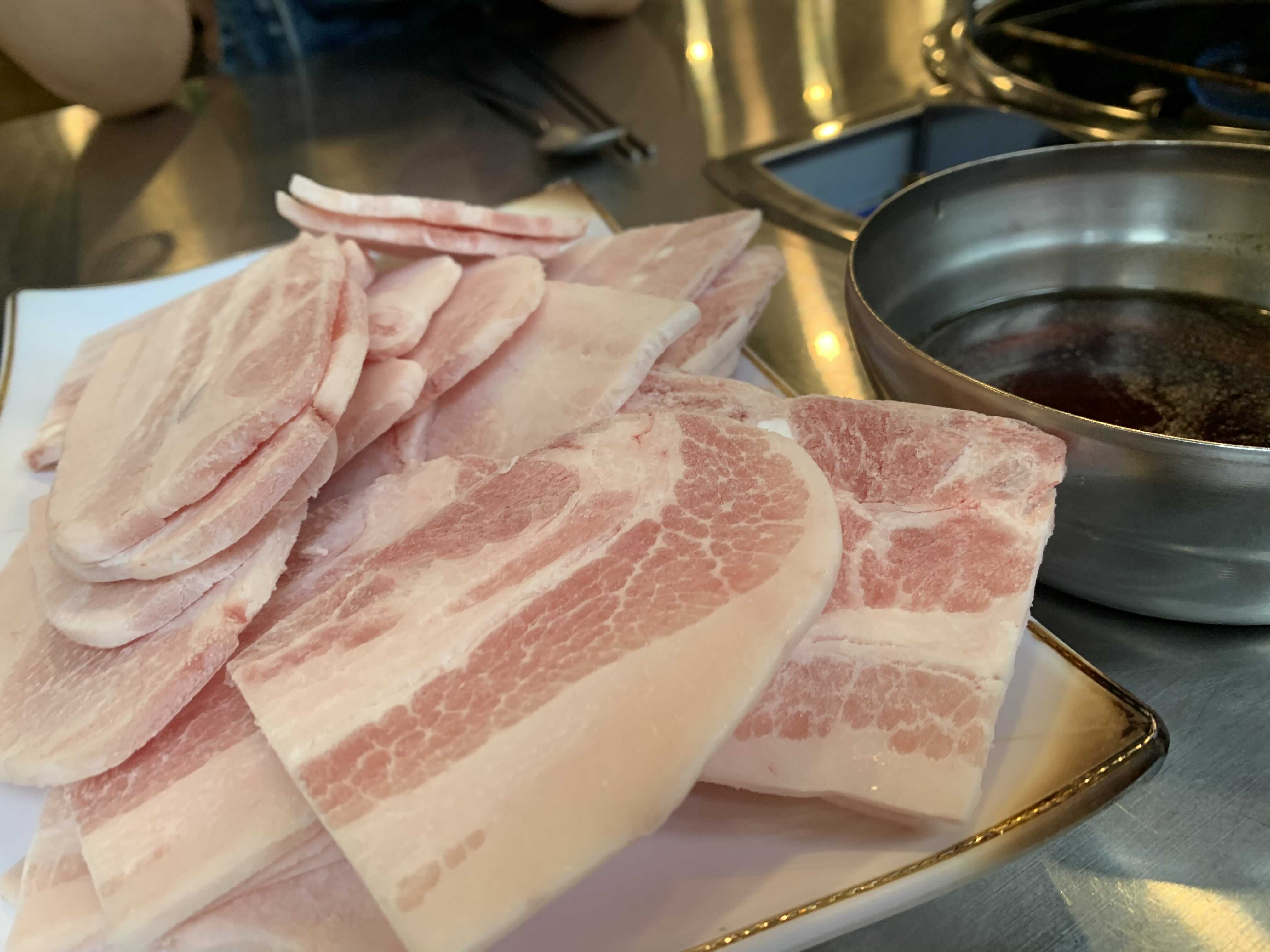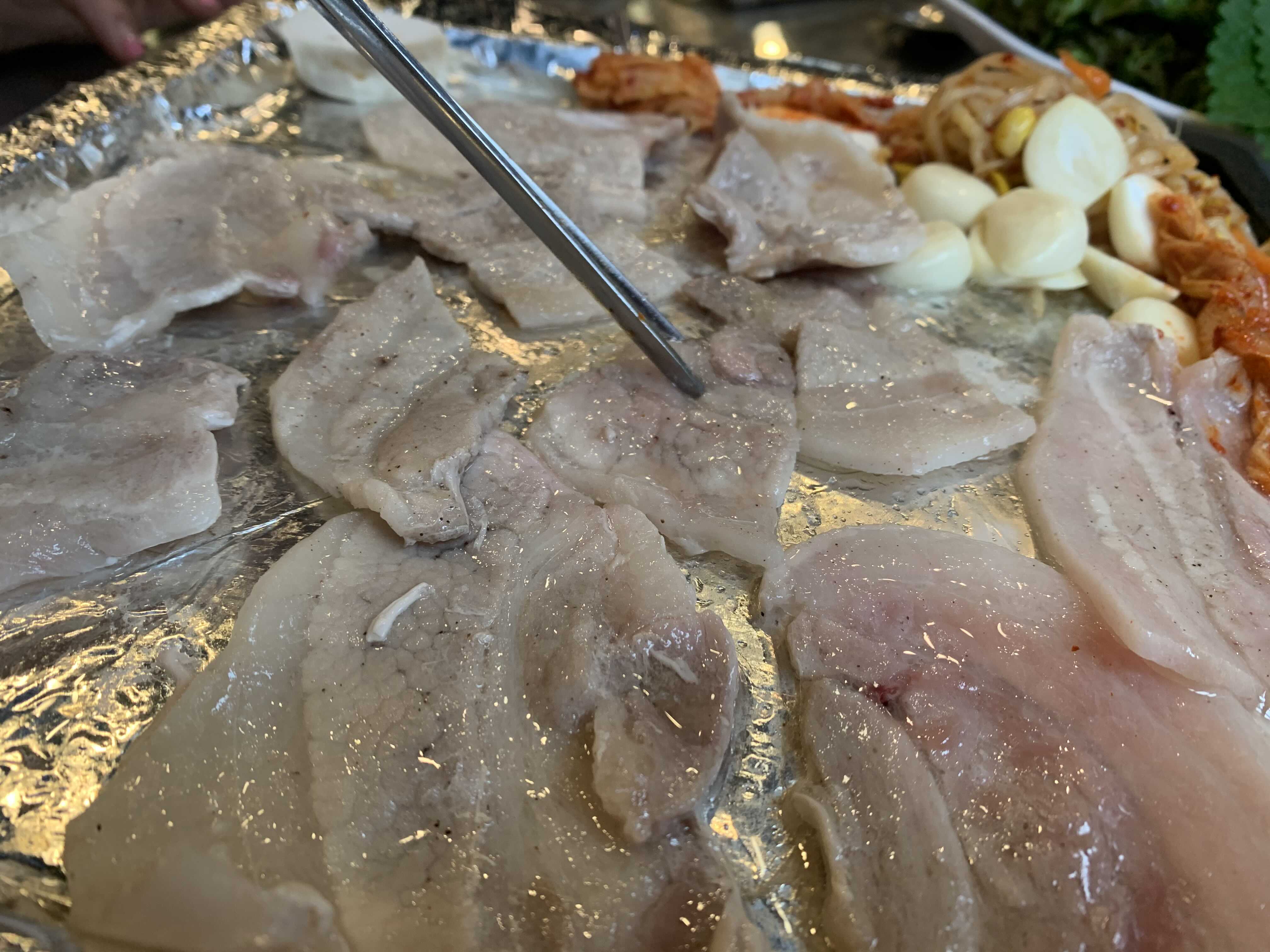 달궈진 불판에 간장물에 적신 삼겹살을 살포시 올려줍니다.
