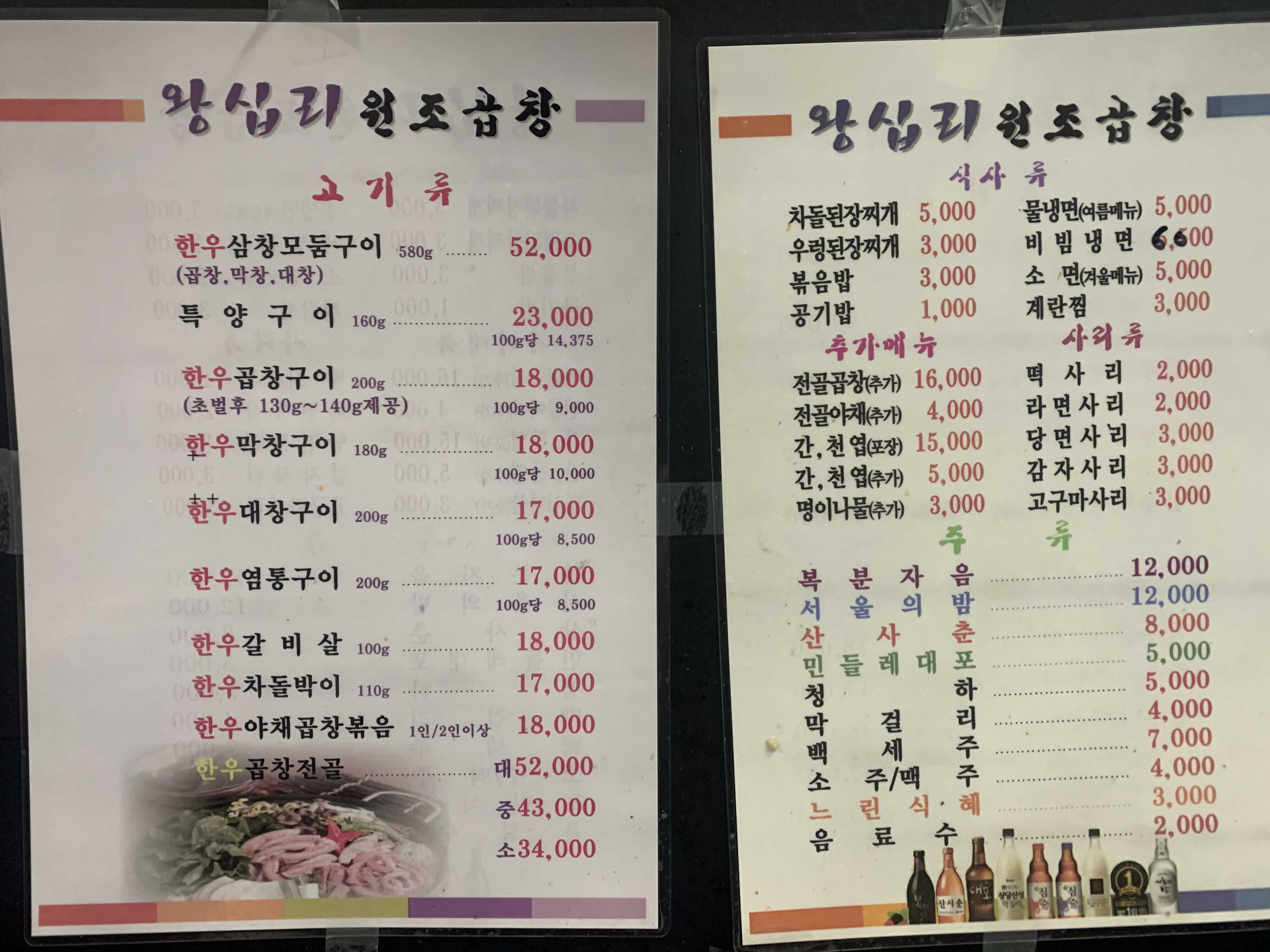 왕십리 원조 곱창의 메뉴들!